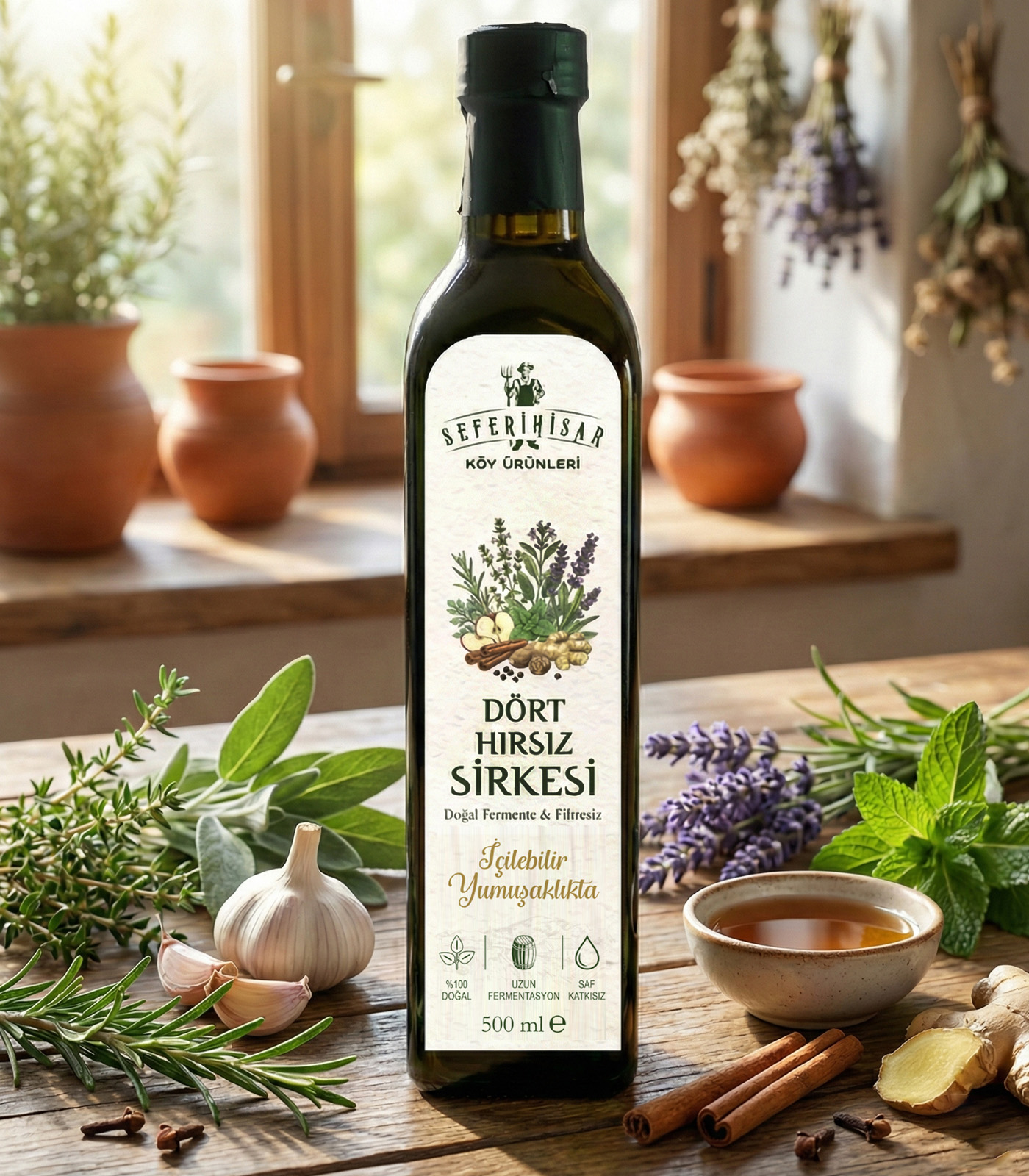 Geçmişin tozlu sayfalarından günümüze kadar ulaşan en gizemli ve güçlü tariflerden biriyle tanışmaya hazır mısınız? Doğal dört hırsız sirkesi, 14. yüzyılda Avrupa'yı kasıp kavuran salgınlardan korunmak isteyenlerin hikayesiyle doğmuş, bugün ise modern mutfakların en kıymetli şifa kaynaklarından biri haline gelmiştir. Seferihisar’ın güneşinde olgunlaşan taze bitkilerin, sabırla yürütülen bir fermantasyon süreciyle buluştuğu bu özel ürün, sıradan bir sirkenin çok ötesinde bir deneyim sunar. Doğal dört hırsız sirkesi üretiminde kullandığımız her bir bitki, doğallığından ödün vermeden özenle seçilir ve “sirke anası” ile birlikte olgunlaşmaya bırakılır.