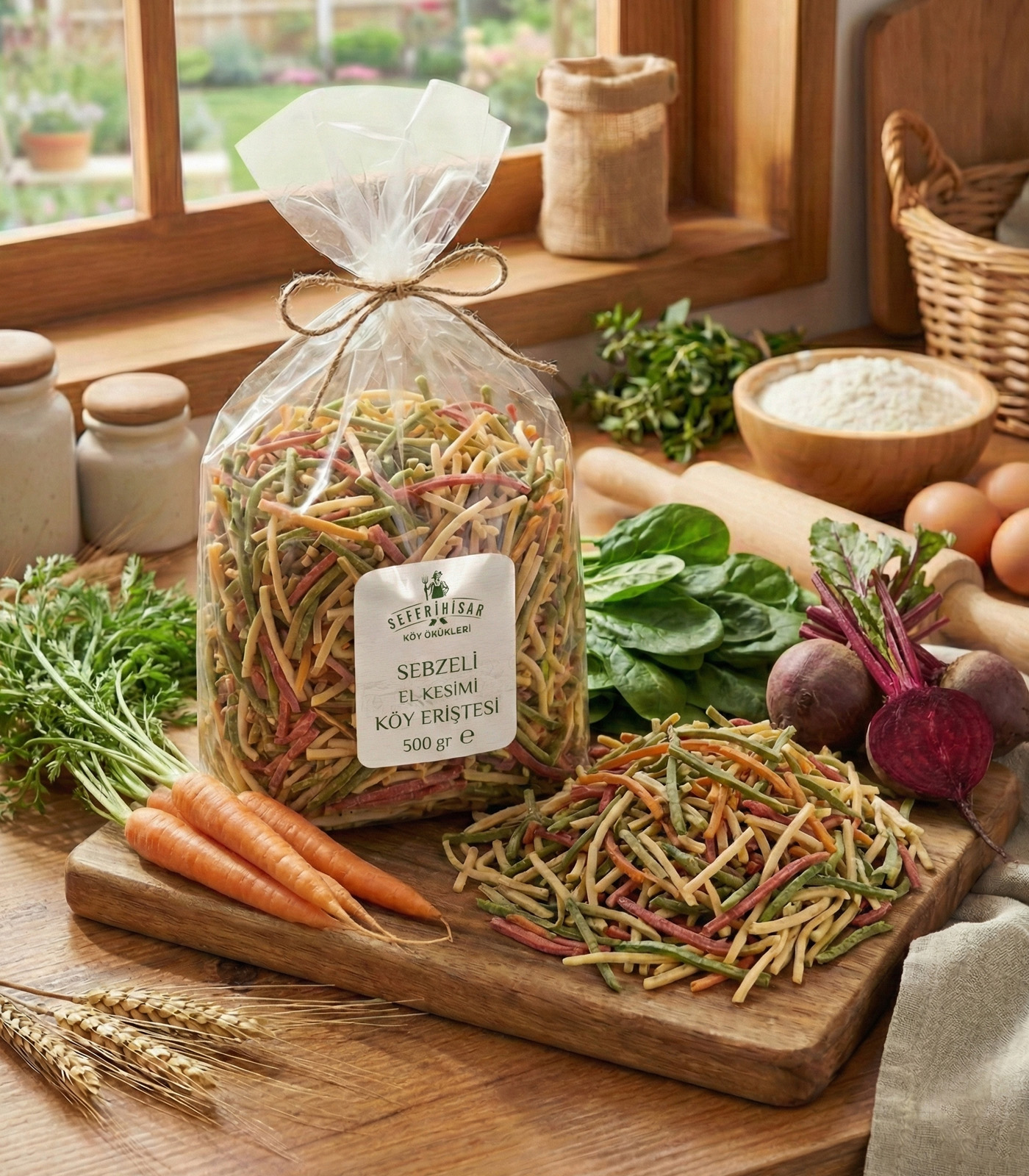 Sofralarınızda bir gökkuşağı görmeye hazır mısınız? Seferihisar’ın taptaze sebzeleriyle hazırladığımız sebzeli köy eriştesi, doğanın en canlı renklerini ve en saf besin değerlerini tek bir pakette buluşturuyor. Fabrikasyon ürünlerin tekdüzeliğinden uzak, her bir tanesi farklı bir hikaye anlatan bu renkli erişte seçkimiz, sadece damaklara değil gözlere de hitap ediyor. İçeriğindeki yeşili taze ıspanaktan, turuncuyu vitamin deposu havuçtan ve o büyüleyici moru ise antioksidan kaynağı pancardan alan ürünümüz, tamamen katkısız doğal bir içeriğe sahiptir.